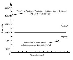 En la ilustración que sigue, puede observarse lo siguiente: la falla existente en el cable, se encuentra ubicada inicialmente en la región 1, esta zona excede la tensión máxima de nuestro generador de impulso, y por tanto no es posible utilizar los métodos de reflectometría descritos más arriba, por lo tanto debemos aplicar el método del quemado para reducir la falla, despues de lo cual, la falla se desplaza a la región 2, donde podemos cebar la falla para ubicar con exactitud su localización.